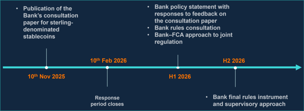 The timeline shows the publication of the consultation on 10 November 2025, the response deadline on 10 February 2026, and a series of policy deliverables through the first and second halves of 2026. These include the Bank’s formal policy statement, a joint Bank–FCA regulatory approach, and the publication of final rules and supervisory expectations later in the year.