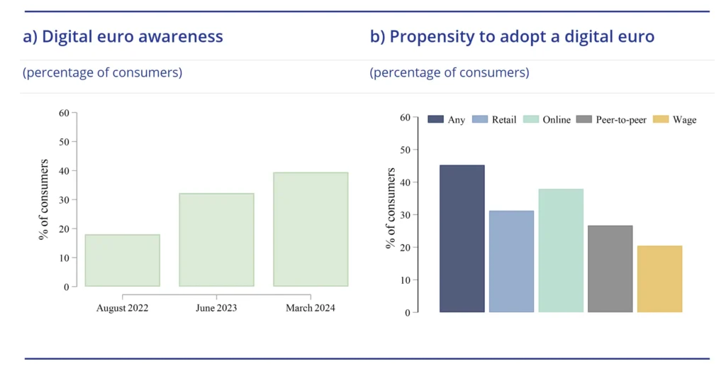 Consumer awareness of the digital euro has increased markedly in recent years, reflecting intensified public communication by the ECB. Survey data show that awareness rose from below one-fifth of consumers in 2022 to around 40 percent by March 2024.